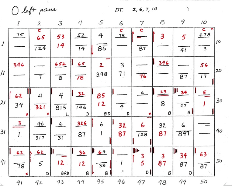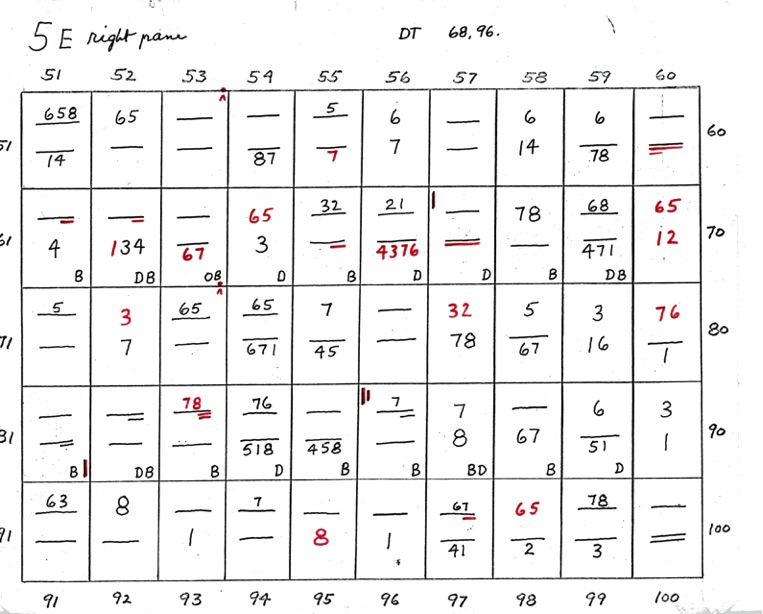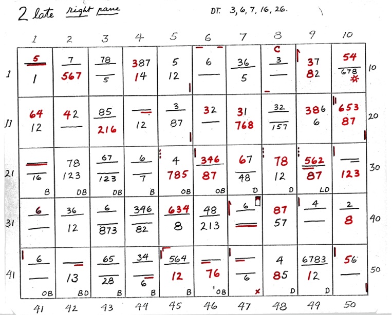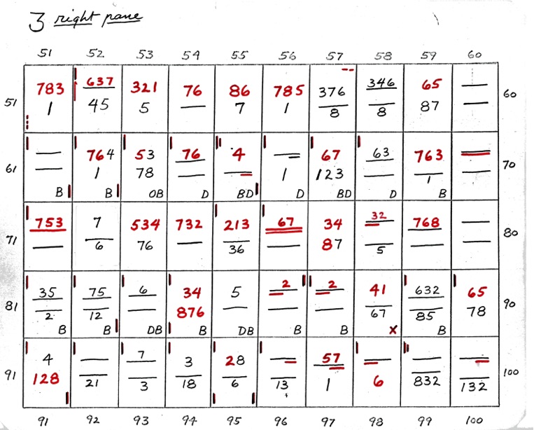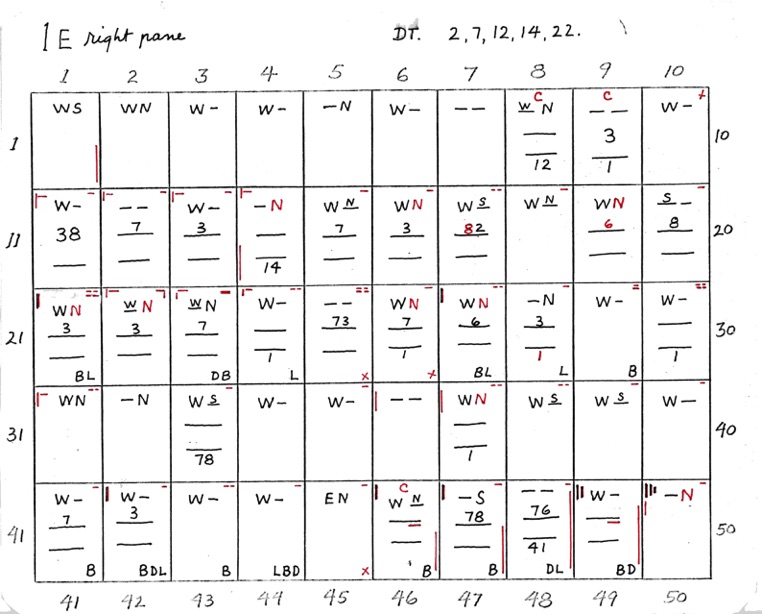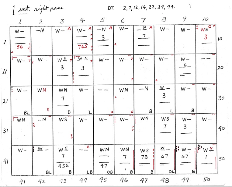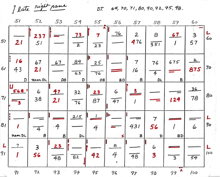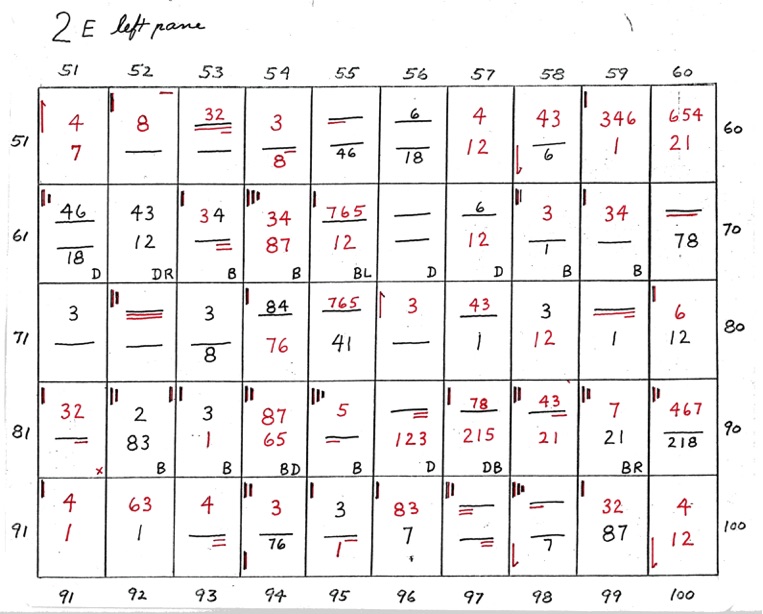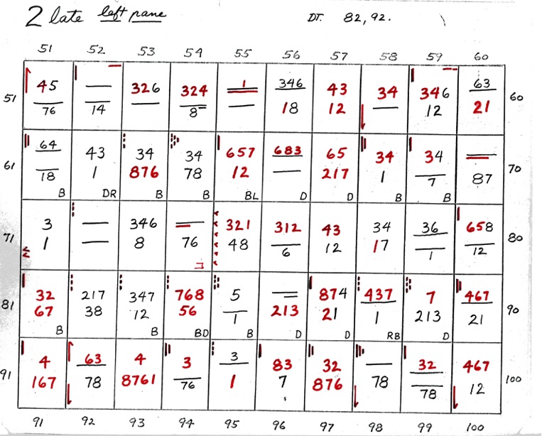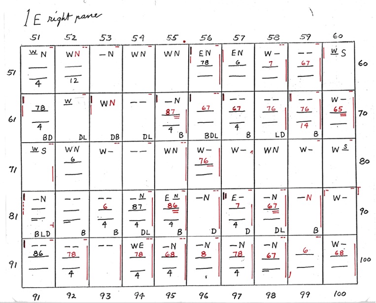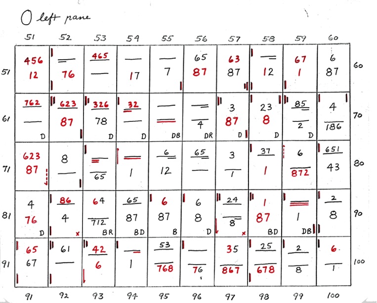 When two numbers, one above the other, are shown - the top number indicates closeness, in sequence, of the 8 points of diagram 1. The bottom number indicates wideness of the 8 points, in sequence. A straight line or dash indicates uncertainty. If the line is underlined at R or L it shows that the right or left side is closer or wider depending on whether the upper or lower line.