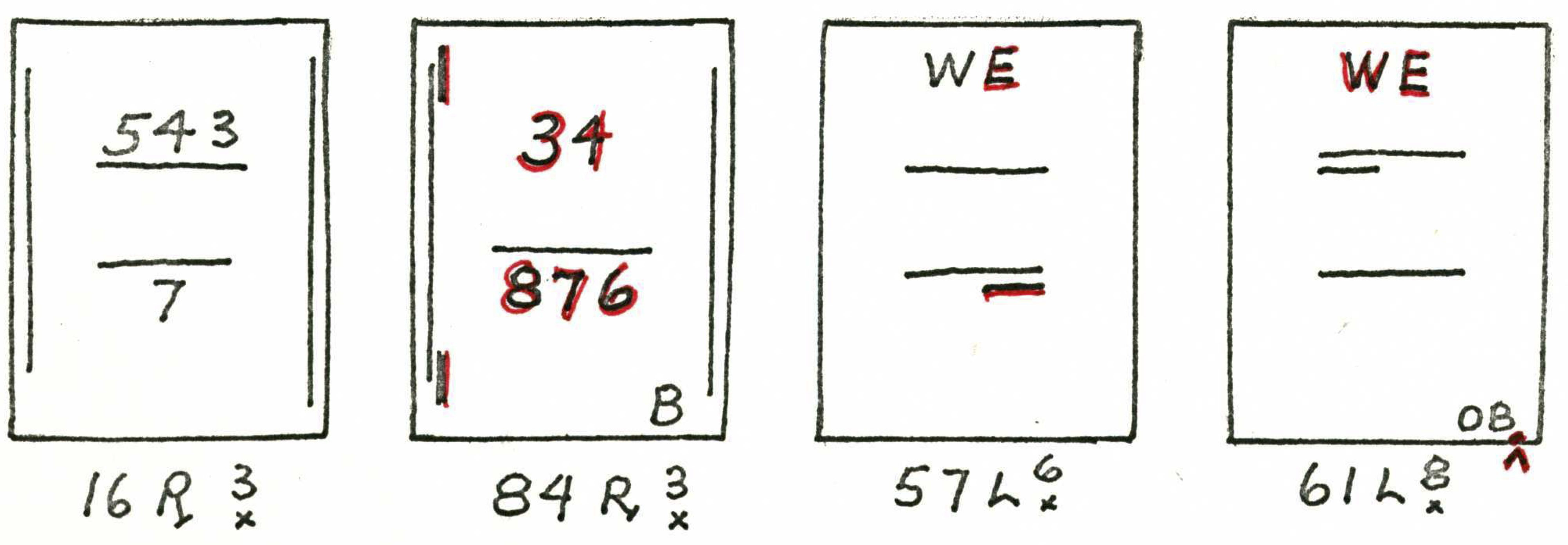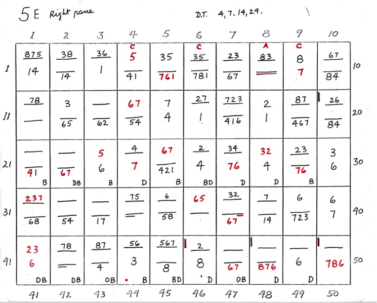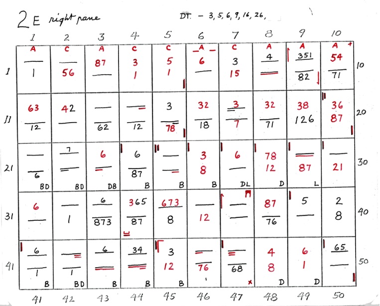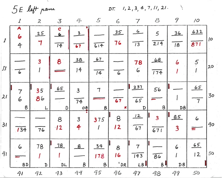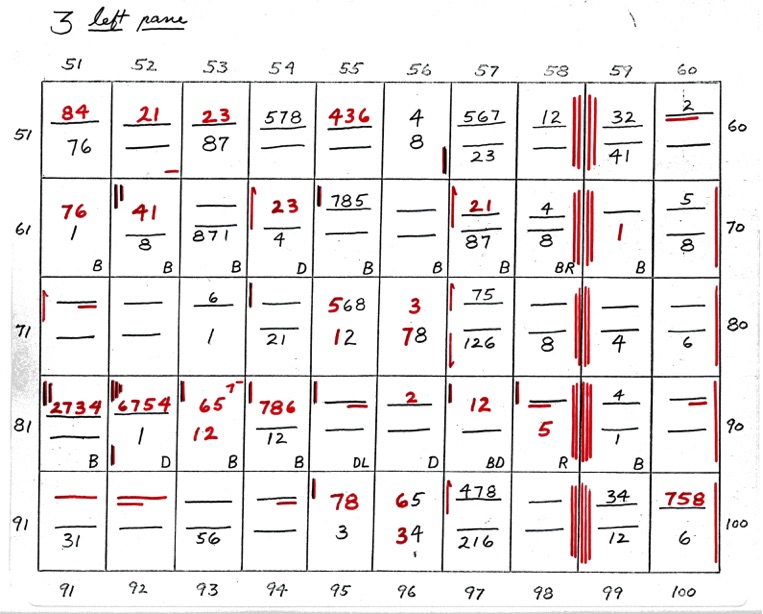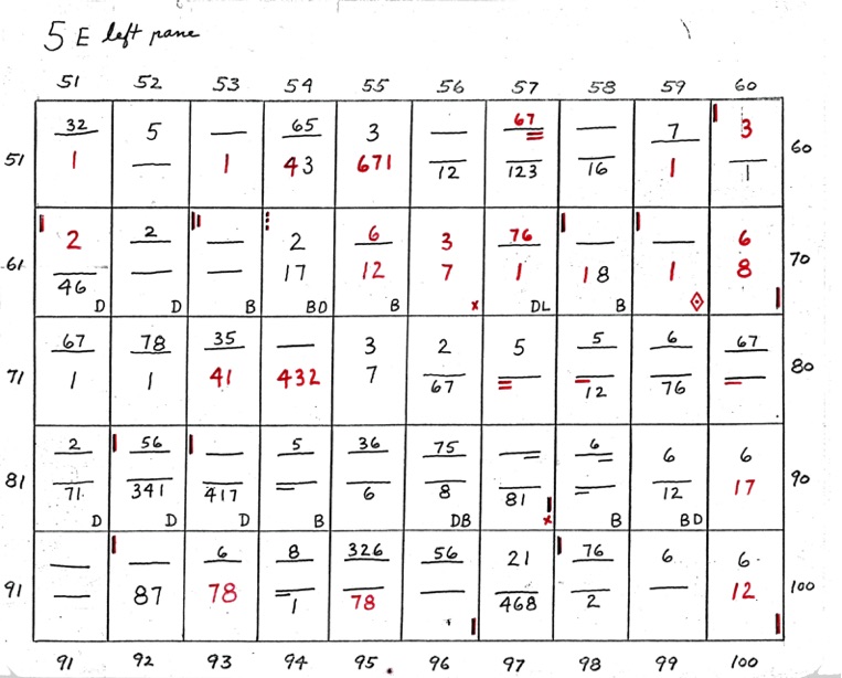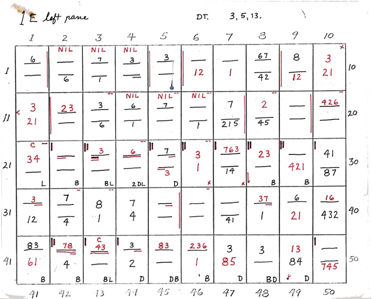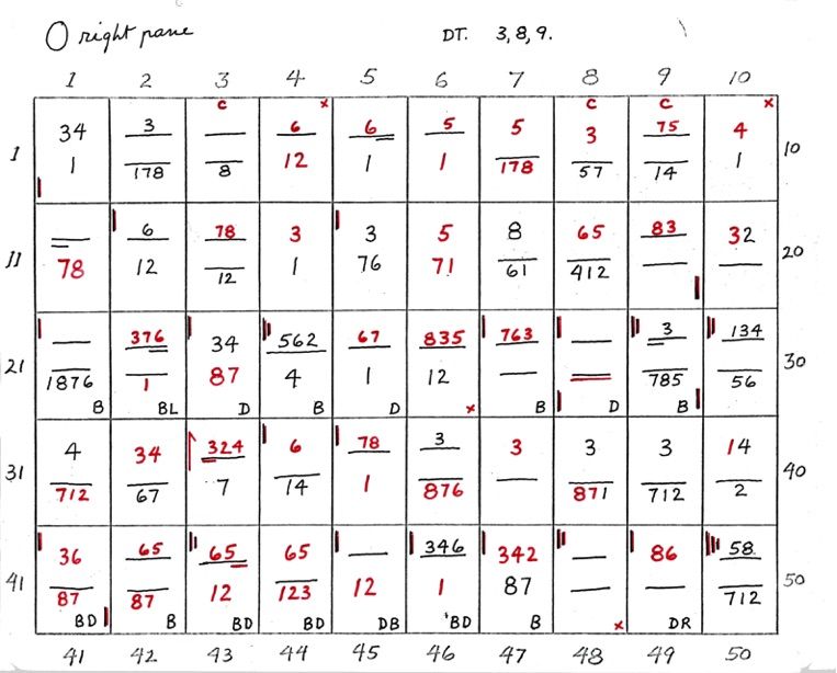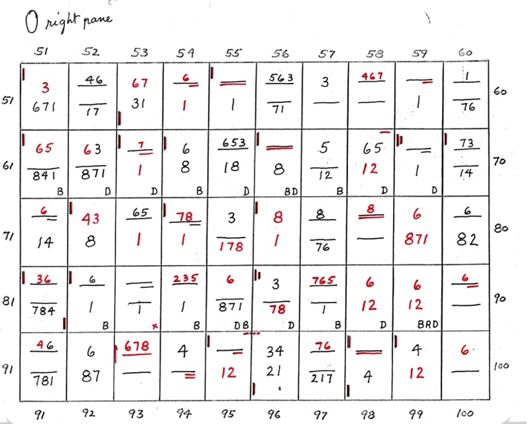 When two numbers, one above the other, are shown - the top number indicates closeness, in sequence, of the 8 points of diagram 1. The bottom number indicates wideness of the 8 points, in sequence. A straight line or dash indicates uncertainty. If the line is underlined at R or L it shows that the right or left side is closer or wider depending on whether the upper or lower line.