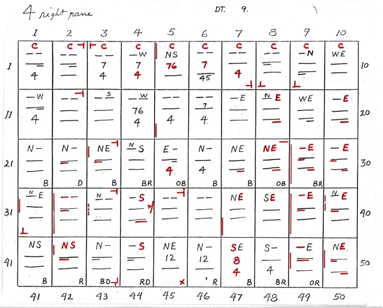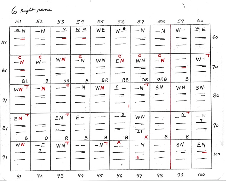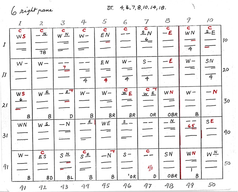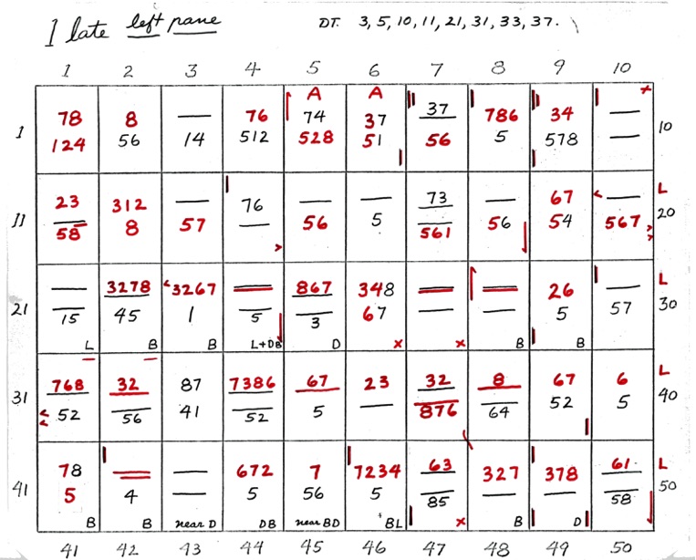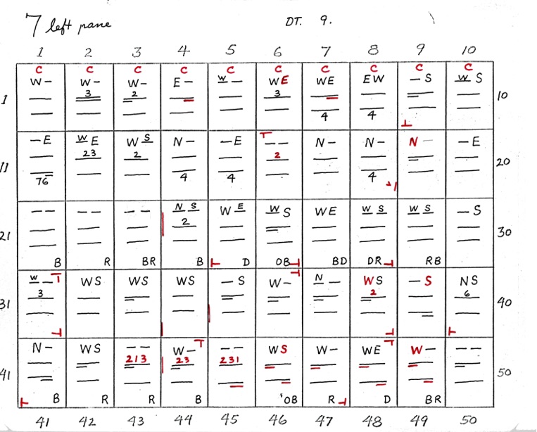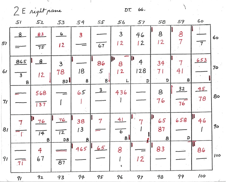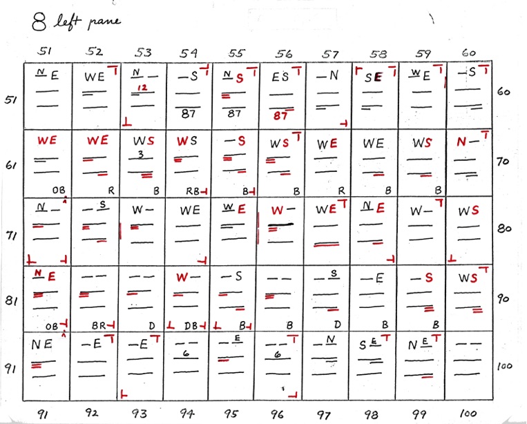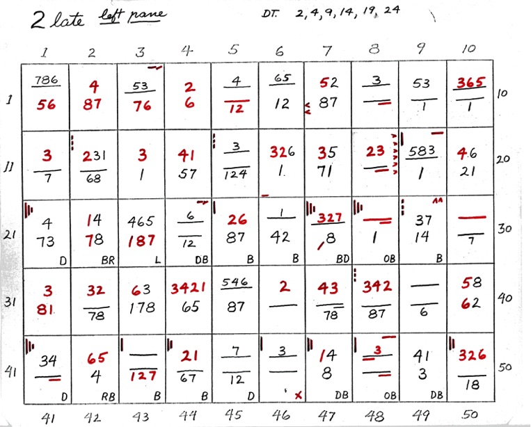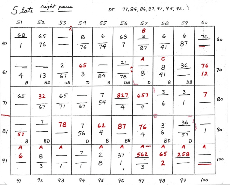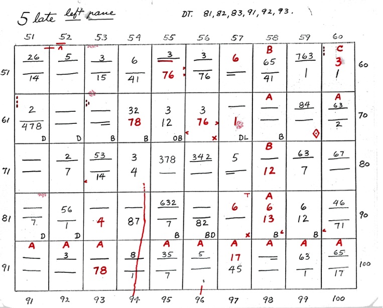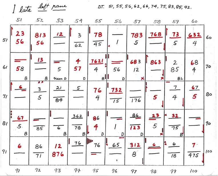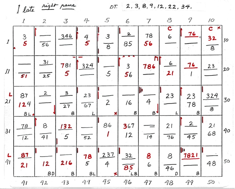 DeVere Card was a preeminent plater of this stamp from the 1930's until his death in 1980. Over many years he developed a plating system to help him plate stamps. During the mid-1970's he worked to develop an article for the USPCS Chronicle to show his plating system, but ill health and lack of color copier technology in those days thwarted his efforts. DeVere Card's plating system consisted of 52 plating charts. Each chart presented two-color diagrammatic notations of particular plating characteristics for one 50-stamp half-pane (or quarter-plate) of the thirteen plates of this plating. DeVere Card introduced a number of "Additional Plating Characteristics" that go far beyond the traditional recuts noted in Dr. Chase's book. All 52 DeVere Card Plating Charts are presented below.