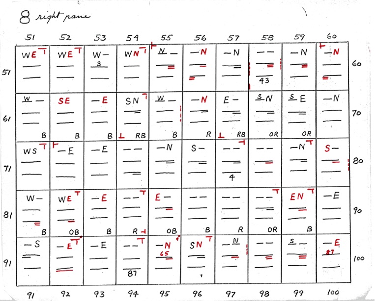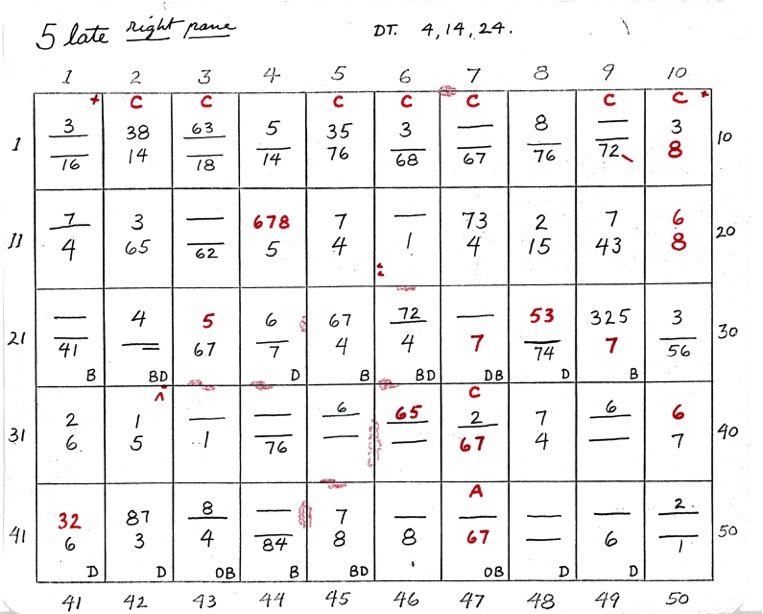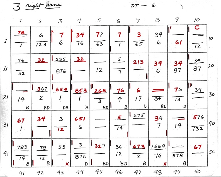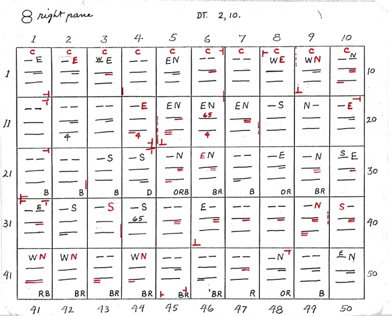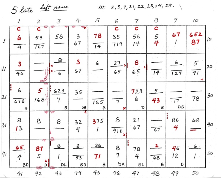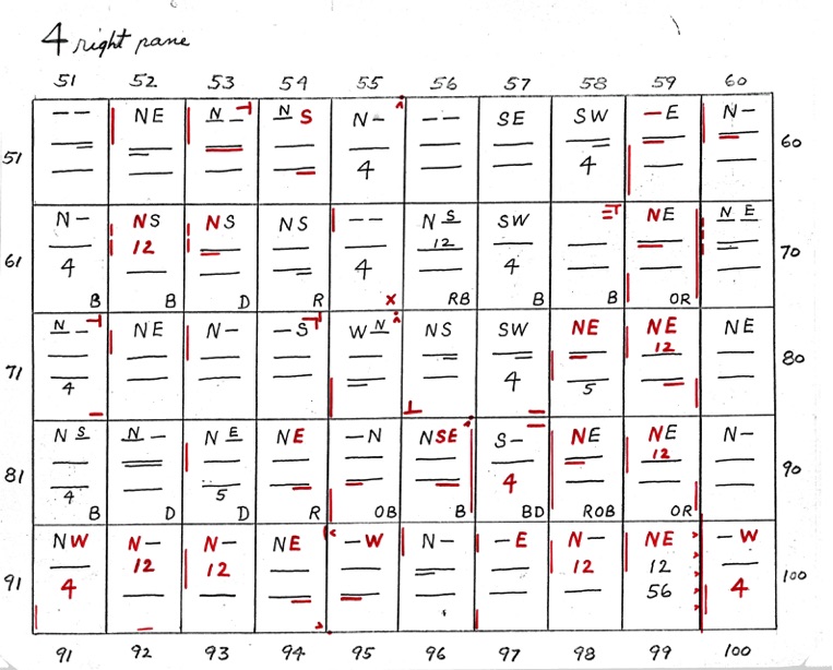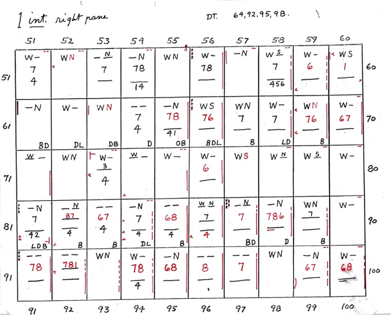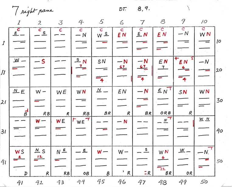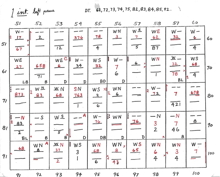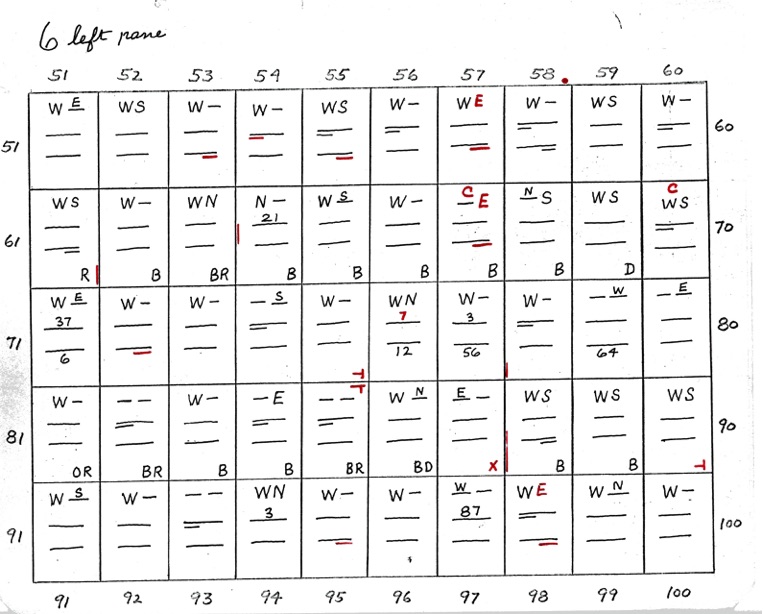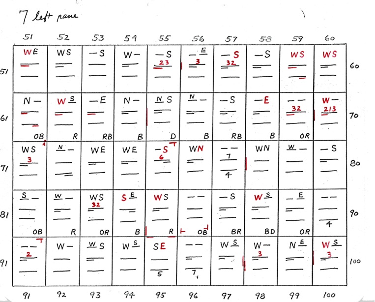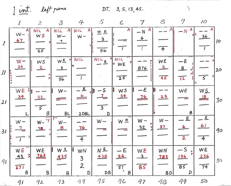 DeVere Card was a preeminent plater of this stamp from the 1930's until his death in 1980. Over many years he developed a plating system to help him plate stamps. During the mid-1970's he worked to develop an article for the USPCS Chronicle to show his plating system, but ill health and lack of color copier technology in those days thwarted his efforts. DeVere Card's plating system consisted of 52 plating charts. Each chart presented two-color diagrammatic notations of particular plating characteristics for one 50-stamp half-pane (or quarter-plate) of the thirteen plates of this plating. DeVere Card introduced a number of "Additional Plating Characteristics" that go far beyond the traditional recuts noted in Dr. Chase's book. All 52 DeVere Card Plating Charts are presented below.