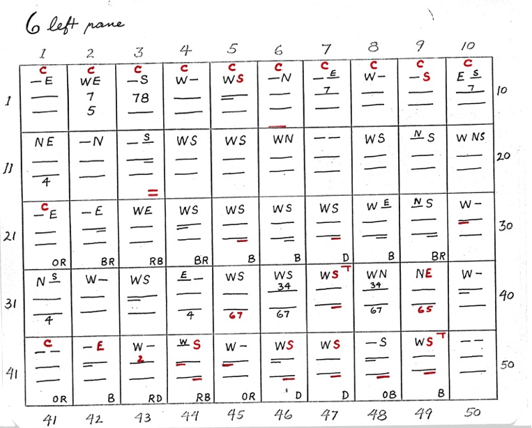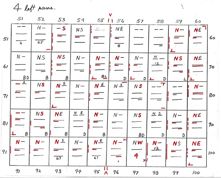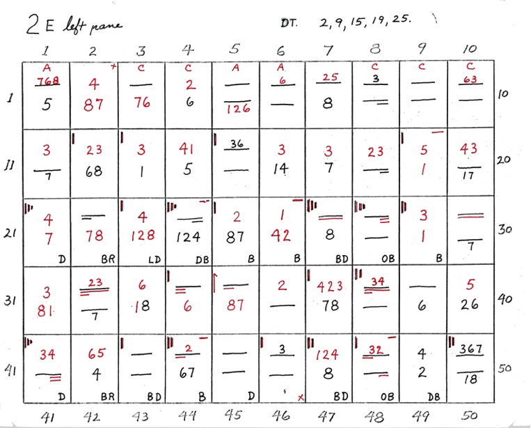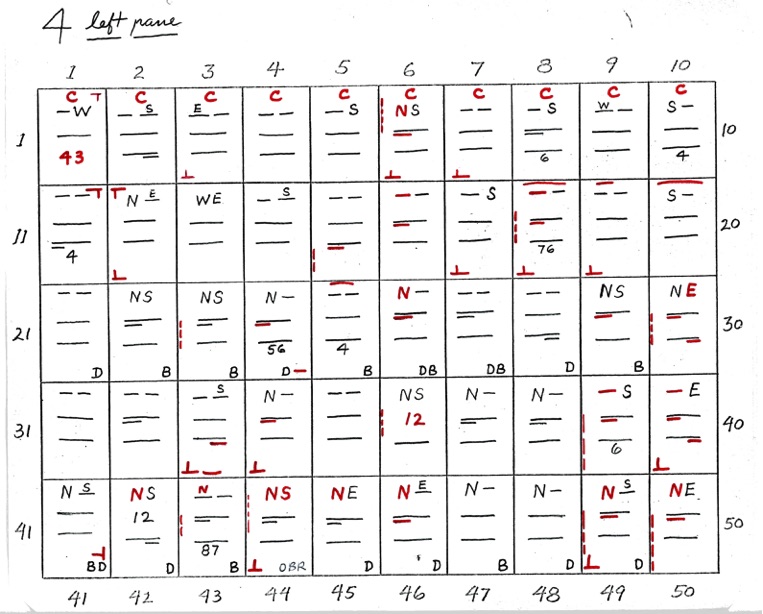We have already stated that these charts are not intended to actually plate stamps; that they indicate where to look to plate by comparison with an already plated copy or by comparison with the Chase plate photos. Repeat – There are very few of the 2,600 positions that should be plated without microscopic comparison with a previously plated copy or with the photograph.